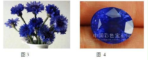 对于蓝宝石而言,也有一种极品,产自印度喀什米尔地区的“矢车菊”蓝宝石(见图3、图4),它为一种朦胧的略带紫色色调的浓重的蓝色,给人以天鹅绒般的外观,但这种蓝宝石产量甚少,目前在市面上已不易看到。