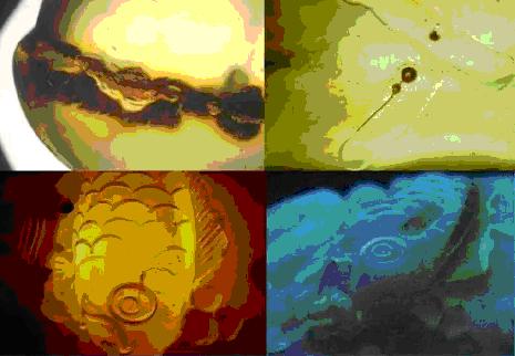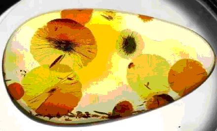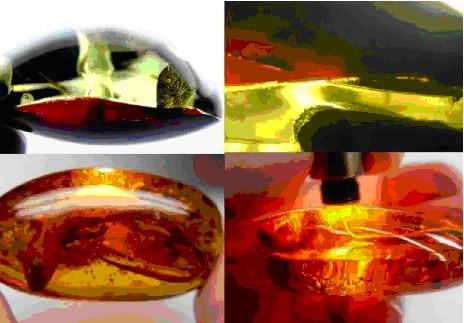 1、热处理(优化):可附加压处理,加深琥珀表面颜色;或使琥珀内部产生片状炸裂纹,通常称为“睡莲叶”或“太阳光芒”;或使琥珀变透明。