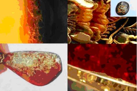 5、压固(优化):分层琥珀原石经压固变致密,放大检查可见流动状红褐色纹,多保留有原始表皮及孔洞,可与再造琥珀相区别。